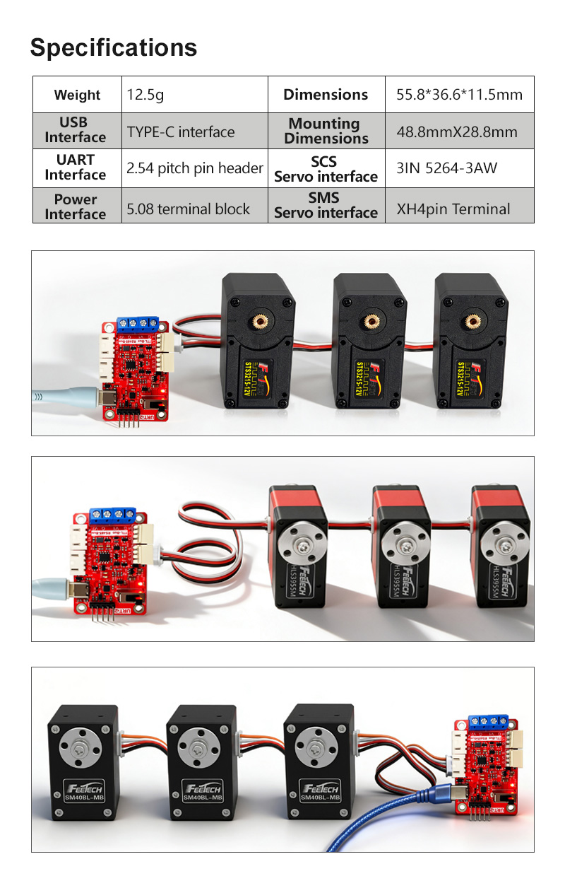 USB port using USB MINI interface; UART interface with 2.54 row spacing general; SMS series servo interface using 5264-4AW interface can be directly connected to the steering gear; SCS series servo interface using 5264-3AW interface can be directly connected to the steering gear.
